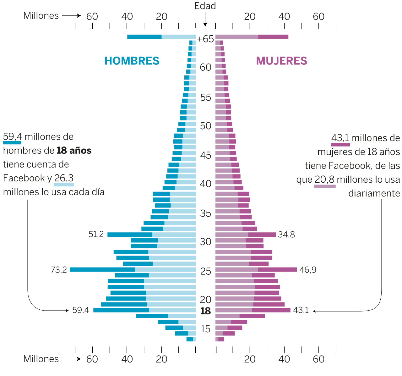 Esses motivos podem ser a proibição paterna ou a falta de interesse, mas, seja como for, não é por enquanto um sintoma grave de envelhecimento para o Facebook: “A pirâmide foi comparada durante vários anos e é estável. Se as pessoas de 13 anos são irrecuperáveis, com as de 14 deveria ser igual. Mas, à medida que as pessoas vão crescendo, vão se ligando no Facebook”, diz Rubén Cuevas. Se o Facebook fosse um país, seria um lugar aonde se emigra aos 20 anos, para não ir mais embora.
