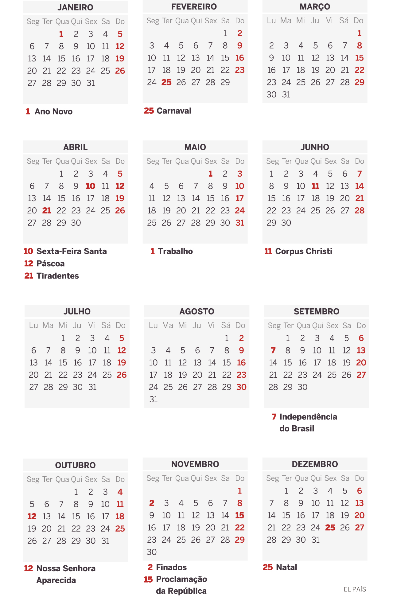 Somente um feriado nacional cai num domingo no novo ano: 15 de Novembro, quando o Brasil celebra a Proclamação da República. Já para as mais de 1.000 cidades do país que consideram o Dia da Consciência Negra um feriado, há mais uma chance de prolongar a folga: 20 de novembro cairá numa sexta-feira em 2020.