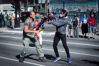 Nas últimas semanas bandeiras ucranianas passaram a dividir espaço com as brasileiras em atos de apoio ao Governo do presidente Jair Bolsonaro. Carregadas nas costas ou penduradas em carros de som, uma delas chamou a atenção: não era o símbolo oficial do país do leste europeu, amarela e azul, mas sim uma variante vermelha e preta, com o tridente ao centro. É o brasão adotado pelo grupo paramilitar de extrema direita Pravyi Sektor (Setor Direito), criado em 2013 e que se tornou partido político na Ucrânia. O coronel Álvaro Batista Camilo, secretário-executivo da Polícia Militar de São Paulo confirmou na noite de domingo que o conflito ocorrido na avenida Paulista, que era palco de um ato pró-democracia e um de apoio a Bolsonaro, teve como estopim a presença desses símbolos: “Provavelmente, [o motivo da briga] seja o pessoal ligado ao neonazismo, que acabaram começando, levando a esse tumulto”. Mas o desejo de “ucranizar” o Brasil não começou na avenida Paulista.